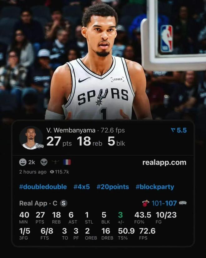 马刺队史25+15+5+5场次:文班第三,上将和邓肯前二